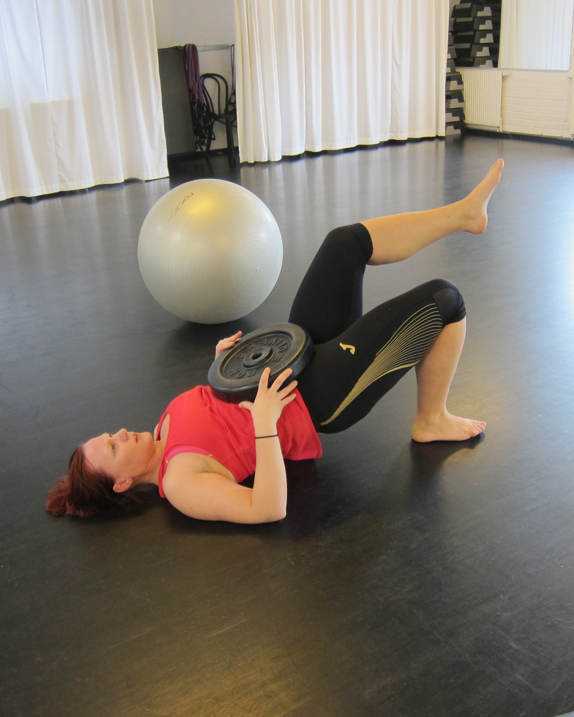 Ligg med höfterna i kanten på brädan. börja med knäna i golvet och pressa hälar i taket med böjda ben.